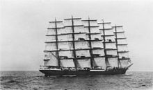 The four-masted, iron-hulled ship, introduced in 1875 with the full-rigged County of Peebles, represented an especially efficient configuration that prolonged the competitiveness of sail against steam in the later part of the 19th century.[47] The largest example of such ships was the five-masted, full-rigged ship Preussen, which had a load capacity of 7,800 tonnes.[48] Ships transitioned from all sail to all steam-power from the mid 19th century into the 20th.[49] Five-masted Preussen used steam power for driving the winches, hoists and pumps, and could be manned by a crew of 48, compared with four-masted Kruzenshtern, which has a crew of 257.[50]