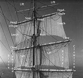 Halyards, used to raise and lower the yards, are the primary supporting lines.[62] In addition, square rigs have lines that lift the sail or the yard from which it is suspended that include: brails, buntlines, lifts and leechlines. Bowlines and clew lines shape a square sail.[55] To adjust the angle of the sail to wind braces are used to adjust the fore and aft angle of a yard of a square sail, while sheets attach to the clews (bottom corners) of a sail to control the sail's angle to the wind. Sheets run aft, whereas tacks are used to haul the clew of a square sail forward.[55]