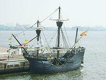 Ships of this era were only able to sail approximately 70° into the wind and tacked from one side to the other across the wind with difficulty, which made it challenging to avoid shipwrecks when near shores or shoals during storms.[30] Nonetheless, such vessels reached India around Africa with Vasco da Gama,[31] the Americas with Christopher Columbus,[32] and around the world under Ferdinand Magellan.[33]