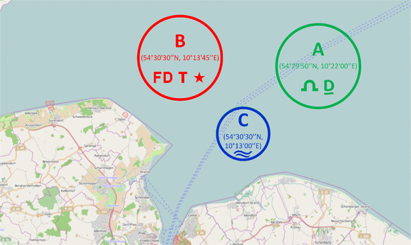 A total of three race areas were set in the Firth of Kiel of the coast of Kiel/Schilksee. The location points to the center of the 2 nm radius circle for course area A & B and to a 1.5 nm radius circle for course area C.