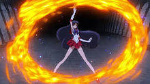 Sailor Mars has the power to create and control fire.[33] Her named powers are somewhat inconsistent across the various series—in the first arc of the manga, she says "Evil spirits, begone!" the same phrase she uses as a civilian while using an ofuda, for her fire attacks. In the anime, she shoots a fireball from her index fingers and shouts the words "Fire Soul"[34] and in the live-action series she shouts "Youma Taisan" ("Monster, begone"). This basic power is improved to "Fire Soul Bird" in the second arc of the anime only;[4] the manga and Sailor Moon Crystal anime also have her develop an animal-based attack, "Mars Snake Fire," but it does not appear until the third story arc and third season respectively.[35] Her first attack to be the same across all versions is "Burning Mandala," which incorporates Buddhist symbolism in the fiery rings Sailor Mars summons.[36] She is not immune to her own powers, as she is able to use them for a suicide move in the anime.[37]