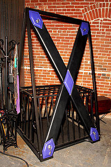 The X-cross, X-frame or saltire cross is a common piece of equipment in BDSM dungeons. It typically provides restraining points for ankles, wrists, and waist. When secured to a saltire, the subject is restrained in a spreadeagle position.
