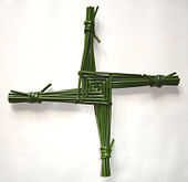 There is some debate over whether St Brigid was a real person. She has the same name and many of the same attributes as the Celtic goddess Brigid, and there are many supernatural events, legends and folk customs associated with her.[6] Like the saint, Brigid the goddess in Irish mythology is associated with poetry, healing, smithcraft, protection and domestic animals (according to Sanas Cormaic and Lebor Gabála Érenn). Furthermore, the saint's feast day falls on the Gaelic traditional festival of Imbolc.[7] Some scholars suggest that the saint is a Christianization of the goddess; others that she was a real person whose mythos took on the goddess's attributes. Medieval art historian Pamela Berger argues that Christian monks "took the ancient figure of the mother goddess and grafted her name and functions onto her Christian counterpart".[8] Professor Dáithí Ó hÓgáin and others suggest that the saint had been chief druid at the temple of the goddess Brigid, and was responsible for converting it into a Christian monastery. After her death, the name and characteristics of the goddess became attached to the saint.[7][9][10]