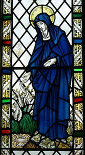 St. Brigid has long been linked to Glastonbury. Sites that depict her include Glastonbury Tor, where the stone carving of her milking a cow can be seen above one side of the entrance,[48] while she is also shown in a Fresco painting that adorns the interior of St. Patrick's Chapel, Glastonbury that can be found within the grounds of Glastonbury Abbey and depict the saint with a spindle, a bowl of fire and a cow in the background.[49]