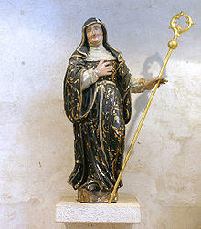 Attributes | an abbess with a shepherd's staff and flames over her head, with a lamp or candle, sometimes with a cow, ducks or geese |