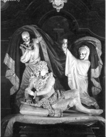 In the 16th, 17th and 18th century St. James' Church was the parish church of Antwerp's prominent citizens, several of whom built private burial chapels in the church. In the church numerous important gravestones are still inside, most belonging to the nobility. There are more than 1300 graves inside the church, and dates of burials of more than 4500 persons. Some graves are of very high quality, famous is the grave of Francisco Marcos de Velasco made by Pieter Scheemaeckers,[3] Ludovicus van Anthoine made by Willem Ignatius Kerricx [4] and Henrica Carolina Adriana Josepha van Cornelissen and Eugenia Catherina van Ertborn both sculpted in marble by Guillaume Geefs.[5] The most famous is that of Antwerp's renowned painter Peter Paul Rubens, completed five years after his death in 1640. The painting above Rubens' tomb is by the master himself.