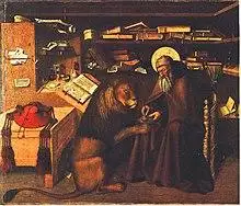 Jerome is also often depicted with a lion, in reference to the popular hagiographical belief that Jerome had tamed a lion in the wilderness by healing its paw. The source for the story may actually have been the second century Roman tale of Androcles, or confusion with the exploits of Saint Gerasimus (Jerome in later Latin is "Geronimus").[52][53][54] Hagiographies of Jerome talk of his having spent many years in the Syrian desert, and artists often depict him in a "wilderness", which for West European painters can take the form of a wood.[55]