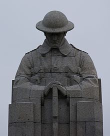 At the end of the war, The Imperial War Graves Commission granted Canada eight sites - five in France and three in Belgium - on which to erect memorials. Each site represented a significant Canadian engagement in the war and for this reason it was originally decided that each battlefield would be treated equally and graced with identical monuments.[4] The Canadian Battlefields Memorials Commission was formed in November 1920 and decided a competition would be held to select the design of the memorial that would be used at the eight European sites.[5] In October 1922, the submission of Toronto sculptor and designer Walter Seymour Allward was selected as the winner of the competition, and the submission of Frederick Chapman Clemesha placed second. The commission decided Allward's monumental design would be used at Vimy Ridge in France as it was the most dramatic location.[6] Originally, Clemesha's 'Brooding Soldier' design was selected for the remaining sites but was later, for a number of reasons, erected only at Saint Julien in Belgium. The remaining six sites at Passchendaele, and Hill 62 in Belgium and Le Quesnel, Dury, Courcelette and Bourlon Wood in France each received an essentially identical Canadian granite block memorial marker, differentiated only with brief inscriptions that describe the battle they commemorate in English and French on their sides. The blocks are situated in small parks that vary in shape and design and are typically situated on key points of the battlefield they memorialize.