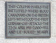 The Memorial's plaque reads: THIS COLUMN MARKS THE BATTLEFIELD WHERE 18000 CANADIANS ON THE BRITISH LEFT WITHSTOOD THE FIRST GERMAN GAS ATTACKS THE 22ND-24TH OF APRIL 1915. 2,000 FELL AND LIE BURIED NEARBY | |