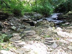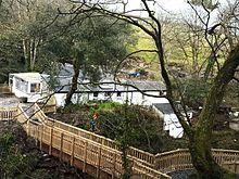 It is believed locally that, in the sixth century, Saint Nectan had a hermitage above the waterfall and rang a silver bell to warn ships of the dangers of offshore rocks at the mouth of the Rocky Valley during storms.[2] However, this is myth concocted by Victorian romanticists such as R. S. Hawker[3] and the valley has no religious connections save the remains of a monastery and a small chapel in nearby Trethevy dedicated to St Piran.[4] The site was known as Nathan's Cave in 1799,[5] named after a local character, either Nathan Williams or Nathan Cock.[6] There is a late nineteenth or early twentieth century half-timbered private residence known as The Hermitage, constructed on the remains of an eighteenth century summer house or folly.[7] Further downstream are the brick remains of St Gerwyn, a house which was destroyed in a fire in the mid-twentieth century. The supposed connection with St Nectan is a Victorian invention and the current use of the site as a place for depositing "sacred offerings" is a more recent invention.[8] The even more recent fashion for calling the waterfall Merlin's Well has no basis in any local tradition. June 17 is the feast day of St Nectan.
