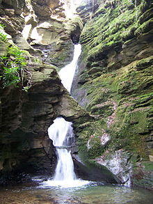 Saint Nectan's Glen (Cornish: Glynn Nathan, meaning deep wooded valley of Nathan) is an area of woodland in Trethevy near Tintagel, north Cornwall stretching for around one mile along both banks of the Trevillet River. The glen's most prominent feature is St Nectan's Kieve, a spectacular sixty foot waterfall through a hole in the rocks. The site attracts tourists who believe it to be "one of the UK's most spiritual sites,"[1] and tie or place ribbons, crystals, photographs, small piles of flat stones and other materials near the waterfall.[2]