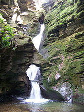 The river is carved into Late Devonian slate and several earlier kieves can be seen further up the rock walls of the waterfall. The current basin is estimated to be around 12 feet (3.7 m) deep, and the water emerges through a natural rock arch to drop a further 10 feet (3.0 m) to a wide shallow pool.