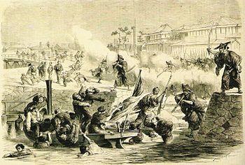 On March 8, 1868, a skiff sent to Sakai was attacked by samurai of the Tosa clan; 11 sailors and midshipman Guillou were killed (a monument in Kobe is now erected to their memory).[1] At the time, the port of Sakai was open to foreign ships, and the Tosa troops were in charge of policing the city.