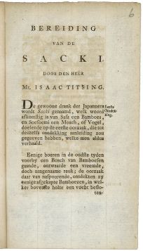 - ^ Titsingh, Isaac. (1781). "Bereiding van de Sacki" ("Production of Sake"), Verhandelingen van het Bataviaasch Genootschap (Transactions of the Batavian Academy). Vol. III. OCLC 9752305