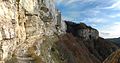 The eastern side of the Salève dives under the molasse of the Bornes Massif while the abrupt mountain slope facing Geneva is subject to erosion. The vegetation - or its absence - enhances the limestone's layers. This side of the mountain is slit by several narrow and deep gorges, among which the Grande Varappe, which at the end of the 19th century gave its name to the activity of rock climbing in French. This discipline developed intensely there, at a time when it was only beginning.