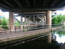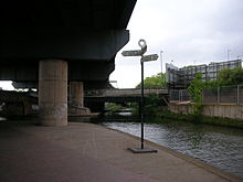 A bridge has been recorded as being at this location since 1536 during the reign of King Henry VIII, however it is believed to have existed since 1290.[4] In the document where it is first mentioned, it is named Shrafford Brugge and described as having four arches of stone.[4] "Shrafford" is a Saxon word meaning "the ford by the caves". The caves were natural, water formed cavities in the face of the nearby Copeley Hill escarpment, which were used as air-raid shelters in World War II and were finally removed upon the construction of Spaghetti Junction. The bridge was to be repaired by the parish of Aston, however, when it was destroyed by Roundhead Parliamentary troops during the English Civil War, reparation costs were charged to the county.[4] The bridge was reconstructed in 1810 to convert the footbridge into a road bridge. It was designed by John Couchman (1771–1838), who was paid £3,800 for the work (equivalent to £272,000 in 2019).[5] The bridge was crossed by a road connecting Birmingham to Lichfield.[6] It was destroyed during the construction of Spaghetti Junction.