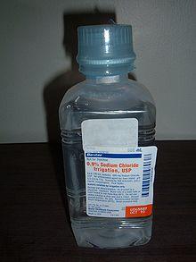 Saline (also known as saline solution) is a mixture of sodium chloride in water and has a number of uses in medicine.[1] Applied to the affected area it is used to clean wounds, help remove contact lenses, and help with dry eyes.[2] By injection into a vein it is used to treat dehydration such as from gastroenteritis and diabetic ketoacidosis.[2][1]