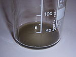 Salmiakki Koskenkorva is a somewhat viscous liquid of characteristic black colour, or dark grayish brown when of a thinner consistency. Upon closer inspection, very fine particulates of carbon black suspension are visible in the liquid.