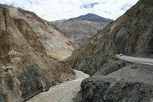 The Salween originates in the Tanggula Mountains in the central Tibetan Plateau. The headwaters are located near Dengka Peak, east of Tanggula Pass.[7] The highest source is Jiangmeiergang Galou glacier, 5,432 m (17,822 ft) above sea level.[1] The various headwater streams flow southwest through high mountain valleys and accumulate in Cona Lake, at 4,594 m (15,072 ft).[8] Downstream of the lake, the Tibetan section of the river is called Gyalmo Nagqu, "black river". In Tibet the river flows mostly within Nagqu prefecture.[1]