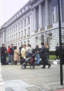 From February 12 to March 11, 2004, under the direction of Mayor Gavin Newsom of San Francisco, officials of the City and County of San Francisco issued marriage licenses to approximately 4,000 same-sex couples despite it being illegal to do so at both the state and federal level. During the month that licenses were issued, couples traveled from all over the United States and from other countries to be married. On August 12, citing the Mayor's lack of authority to bypass state law, the Supreme Court of California ruled that the marriages were void.[8] Consolidated lawsuits against the State Government in favor of same-sex marriage which followed eventually reached the Supreme Court of California. On May 15, 2008, it overturned the state's ban on same-sex marriage with the ruling In re Marriage Cases.[9] The four-to-three decision took effect on June 16, 2008.[10] Two weeks earlier, the initiative to override this result of the court decision qualified for the November election ballot. The Court declined to stay its decision until after the November elections.[11] Some reports suggested that out-of-state same-sex couples would marry in California prior to the 2008 elections because California does not require the marriage to be valid in the couple's home state.