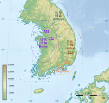 Samhan, or Three Han, is the collective name of the Byeonhan, Jinhan, and Mahan confederacies that emerged in the first century BC during the Proto–Three Kingdoms of Korea, or Samhan, period. Located in the central and southern regions of the Korean Peninsula, the Samhan confederacies eventually merged and developed into the Baekje, Gaya, and Silla kingdoms.[1] The name "Samhan" also refers to the Three Kingdoms of Korea.[2]