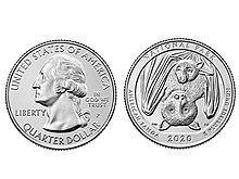 In 2018, the U.S. Mint had several candidate designs developed for the 2020 America the Beautiful National Park of American Samoa Quarter, which was in accordance with the act that authorized them. One of the designs features the familiar image of George Washington by John Flanagan, used on the quarter (heads) since 1932. The (tails) of the quarter features a Samoan fruit bat mother hanging in a tree with her pup. The image represents the remarkable care and energy that this species puts into their offspring. This design is intended to promote awareness to the threatened status of this species due to habitat loss and commercial hunting. The National Park of American Samoa is the only known park in the United States that is home to the Samoan fruit bat. The bats on the coins were designed by Richard Masters, who worked as Professor Emeritus at the University of Wisconsin Oshkosh’s Department of Art. The designs were selected by the Citizen’s Coinage Advisory Committee (CCAC) and the Commission on Fine Art (CFA). The coin was released to the public in February 2020, and will be followed by four other America the Beautiful quarters for the remainder of 2020.[5][6]