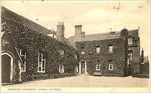 Born in St Botolph's parish, Colchester, Essex,[2] the son of William Halsnoth, a baker, and his wife Agnes,[3] Harsnett was probably educated at Colchester's free school, now Colchester Royal Grammar School.[1] After leaving school, he was inducted into King's College, Cambridge on 8 September 1576[1] and removed into Pembroke College, Cambridge[4] where he gained a BA in 1580/1[5] and was elected a Fellow on 27 November 1583.[1] In 1583 he was ordained into the Church of England,[1] where he was soon disciplined by Archbishop Whitgift for preaching against predestination at St Paul's Cross on 27 October 1584.[1] As Hughson notes, "he was one of those divines who opposed the decrees of the synod of Dort and he wrote a very learned treatise against absolute predestination".[2] In 1584 he proceeded Master of Arts by seniority.[1]
