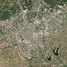 San Antonio is approximately 75 miles (121 km) to the southwest of its neighboring city, Austin, the state capital, about 190 miles (310 km) west of Houston, and about 250 miles (400 km) south of the Dallas–Fort Worth area. The city has a total area of 465.4 square miles (1,205.4 km2); 460.93 square miles (1,193.8 km2) of San Antonio's total area is land and 4.5 square miles (11.7 km2) of it is water.[43] The city's gently rolling terrain is dotted with oak trees, forested land, mesquite, and cacti. The Texas Hill Country reaches into the far northern portions of the city. San Antonio sits on the Balcones Escarpment. Its altitude is approximately 662 feet (202 m) above sea level.[44]