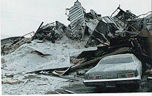Buried six feet underground alongside the track is a 14-inch high-pressure petroleum transit pipeline operated by Calnev Pipeline. The pipeline was marked with stakes during cleanup to avoid the risk of it being accidentally damaged. Pipeline officials remained on site as safety observers during the cleanup of the rail cars, but not during the cleanup of the trona material. Service on the track where the derailment happened was restored four days after the crash. Thirteen days after the train wreck on May 25, 1989, at 8:05 a.m., shortly after eyewitnesses heard a train pass through the derailment site, the pipeline burst at a point on the curve where the derailment happened, showering the neighborhood with gasoline, which ignited into a large fire that burned for close to seven hours and emitted a plume of flames three hundred feet into the air. By the time the fire was out, it had fatally burned two people, and destroyed eleven more houses and 21 cars. Of the houses destroyed, five were directly across the street from houses that had been destroyed in the derailment, while another was the only house on the track side of Duffy Street to have been spared damage during the derailment. Four more houses received moderate smoke and fire damage, while three others had only smoke damage.[4][5] The total property damage was US$14.3 million (equivalent to $29.5 million in 2019), with more of this damage resulting from the fire than from the train derailment, although there were more fatalities from the derailment.[6]