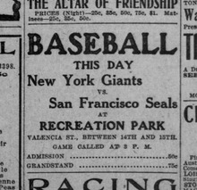The San Francisco Seals were a minor league baseball team in San Francisco, California, that played in the Pacific Coast League from 1903 until 1957 before transferring to Phoenix, Arizona. The organization was named for the abundant California sea lion and harbor seal populations in the Bay Area. The 1909, 1922, 1925, and 1928 Seals were recognized as being among the 100 greatest minor league teams of all time.[1]