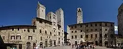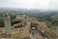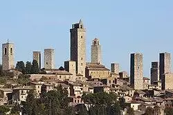 San Gimignano (Italian pronunciation: [san dʒimiɲˈɲaːno]) is a small walled medieval hill town in the province of Siena, Tuscany, north-central Italy. Known as the Town of Fine Towers, San Gimignano is famous for its medieval architecture, unique in the preservation of about a dozen of its tower houses,[3] which, with its hilltop setting and encircling walls, form "an unforgettable skyline".[4] Within the walls, the well-preserved buildings include notable examples of both Romanesque and Gothic architecture, with outstanding examples of secular buildings as well as churches. The Palazzo Comunale, the Collegiate Church and Church of Sant' Agostino contain frescos, including cycles dating from the 14th and 15th centuries.[4] The "Historic Centre of San Gimignano" is a UNESCO World Heritage Site.[4] The town also is known for saffron, the Golden Ham, and its white wine, Vernaccia di San Gimignano, produced from the ancient variety of Vernaccia grape which is grown on the sandstone hillsides of the area.[5][6]