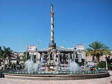The Plaza de Armas or Rita Pérez de Moreno Civic Plaza is in the center of the city. It was designed by Roque Picaso in the 18th century, and later modified by Salvador Gómez. In the center, there is a Monument to Independence, erected in 1872. It consists of a thin column supported by a base which has four dragon figures. At the top, there is marble sculpture of a woman holding a laurel crown. The monument stand in the center of a large circular fountain.[4]