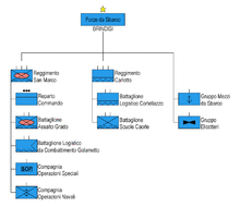 The 1st San Marco Regiment (Italian: 1° Reggimento San Marco), located in Brindisi, is an amphibious formation of the Italian Navy. They are the Italian marines. Until the middle of the 1990s the unit was known as the San Marco Battalion (Battaglione San Marco), until it was expanded beyond battalion size because of the new geopolitical situation after the end of the Cold War and an increasing number of international missions, after as the San Marco Regiment. In 2013 it became part of the San Marco Marine Brigade as 1st San Marco Regiment.