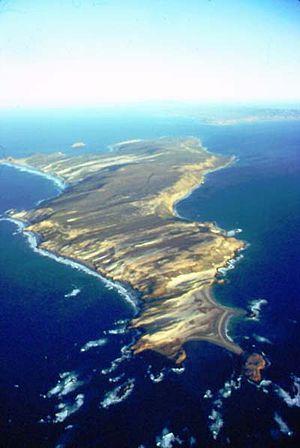 San Miguel Island (Island Chumash: Tuqan)[1] is the westernmost of California's Channel Islands, located across the Santa Barbara Channel in the Pacific Ocean, within Santa Barbara County, California. San Miguel is the sixth-largest of the eight Channel Islands at 9,325 acres (3,774 ha), including offshore islands and rocks. Prince Island, 700 m (2,300 ft) off the northeastern coast, measures 35 acres (14 ha) in area. The island, at its farthest extent, is 8 miles (13 km) long and 3.7 miles (6.0 km) wide.