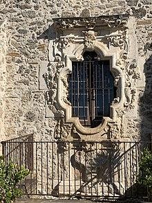 The church facade features from the top: a cross, representing Jesus Christ, St. Joseph (San José) holding the infant Jesus, St. Dominic and St. Francis, Our Lady of Guadalupe (the Virgin Mary), and St. Joachim and St. Anne holding the infant Mary. Located at the south wall of the church sacristy is the Rose Window. Sculptor and significance of the Rose Window is unknown. According to folklore, the window was sculpted by a Spanish master craftsman and artist Pedro Huizar[5] and dedicated it to his sweetheart Rosa who, on her way from Spain to meet with Pedro, tragically lost her life at sea. The Rose Window was sculpted in 1775 and is an example of Baroque architecture in America.[6]