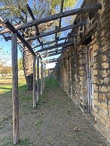 A new church, which is still standing, was constructed in 1768 from local limestone.[4] The mission lands were given to its Indians in 1794, and mission activities officially ended in 1824. After that, the buildings were home to soldiers, the homeless, and bandits. Starting in 1933, the Civil Works Administration and then the Works Progress Administration provided the labor to rebuild and restore the grounds of the mission. Some of the funding for the restoration came from money allotted by the United States for the Texas Centennial Exposition held in Dallas in 1936. The mission walls and Indian quarters were re-built, and the granary was restored.