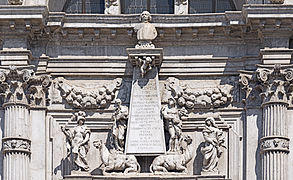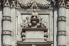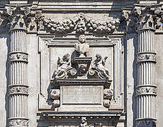 The elaborate Baroque facade, dating from 1668, is profusely decorated with sculpture. Some of its sculptures are generally attributed to German artist Heinrich Meyring. The architectural design attributed to Alessandro Tremignon, with patronage by Vincenzo Fini, whose bust is found over the entry door. Statues in public spaces were forbidden in Venice, thus by putting his bust on the facade of a church, he could circumvent this ordinance and display his wealth and his recent addition to the Libro d'Oro or Venetian aristocracy.