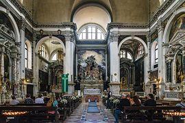 The interior is dominated by Meyring's huge and mannerist sculptural set piece and altarpiece, depiction Moses at Mount Sinai receiving the Tablets, created by Tremignon and Meyring. Behind it is a canvas painted by Michelangelo Morlaiter. It also has a Washing of the Feet by Tintoretto,[1] and a Last Supper by Palma il Giovane. The altarpiece of the Deposition (1636) was painted by Niccolò Roccatagliata in collaboration with Sebastiano.