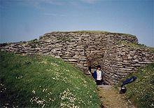 The Neolithic Quoyness chambered cairn, dates from around 2900 BC. An arc of Bronze Age mounds surrounds this cairn on the Elsness peninsula.[18] A large man-made mound at Pool was excavated in the 1980s. This indicated a Neolithic structure made of turf or burnt peat, a later pre-Viking sub-circular structure with pavings and cells, and a Viking stone and turf rectangular building dated to the late 8th or early 9th century. Various implements were also discovered including pre-Norse hipped pins and pottery from both the pre-Viking and Norse periods. A predominance of fish and animal bones suggests the site was used for meat processing.[19] Storms in January 2005 exposed a Bronze Age burnt burial mound at Meur.[20] There are several ruined Iron Age brochs on the island such as the Broch of Wasso, a 5-metre-high (16 ft) mound at Tres Ness.[21]