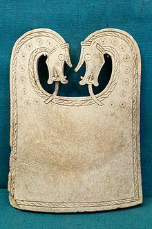 Orkney became part of the Scandinavian polity from perhaps the 9th century onwards. In 1991 the Scar boat burial was discovered on the coast of Sanday near Burness. This Norse-era vessel, which had been 6.5-metre (21 ft) long and 1.5-metre (4.9 ft) wide, had rotted away, leaving more than 300 iron rivets.[25] The enclosure, dated to 875—950 AD, was found to contain the remains of a man, a woman, and a child, along with numerous grave goods. These included a sword, quiver with arrows, bone comb, gaming pieces and the Scar dragon plaque, made from whale bone.[25][26]