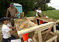 Sandbags being filled using improvised methods, lumber and traffic cones as chutes, Iowa City, Iowa, 2008.