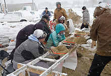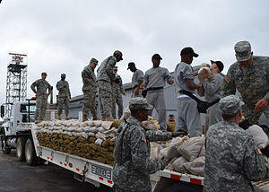 The military uses sandbags for field fortifications and as a temporary measure to protect civilian structures. Because burlap and sand are inexpensive, large protective barriers can be erected cheaply. The friction created by moving soil or sand grains and tiny air gaps makes sandbags an efficient dissipator of explosive blast.[4] The most common sizes for sandbags are 14 by 26 inches (36 by 66 cm) to 17 by 32 inches (43 by 81 cm).[5][6] These dimensions, and the weight of sand a bag this size can hold, allow for the construction of an interlocking wall like brickwork.