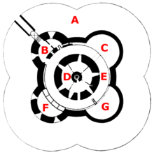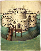 The castle was built between April 1539 and the autumn of 1540, by a team including Richard Benese as the surveyor, William Clement as the master carpenter, and Christopher Dickenson as the master mason.[12] It was nearly identical to its sister castle at Walmer, with a tall keep, 83 feet (25 m) across, at the centre, and flanked by four rounded bastions, also called lunettes, and a moat, which was surrounded in turn by a curtain wall.[13] Its curved walls were 15 feet (4.6 m) thick.[14] In total it was approximately 165 by 165 feet (50 by 50 m) across, covering 0.59 acres (0.24 ha).[15] The historian John Hale considered the castle to form a transitional design between older medieval English designs and newer Italian styles of defence.[16]