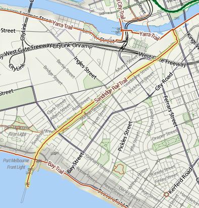 The Sandridge Trail connects with the Bayside Trail in the west. Heading north leads to West Gate Bridge and the Yarra River punt. Heading south leads to St Kilda. The Capital City Trail is located at the east end and runs into the Melbourne city centre. Cyclists arriving from Tasmania on the Spirit of Tasmania can access the CBD using this path.