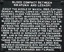 The Sandugo was a blood compact, performed in the island of Bohol in the Philippines, between the Spanish explorer Miguel López de Legazpi and Datu Sikatuna the chieftain of Bohol on March 16, 1565, to seal their friendship as part of the tribal tradition. This is considered as the first treaty of friendship between the Spaniards and Filipinos. "Sandugo" is a Visayan word which means "one blood".[1]