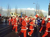 The Guinness World Record for the largest gathering of Santa Clauses is held by Thrissur, Kerala, India where on 27 December 2014, 18,112 Santas overtook the previous record. Derry City, Northern Ireland had held the record since 9 September 2007, when a total of 12,965 people dressed up as Santa or Santa's helpers. Prior to that, the record was 3,921, which was set during the Santa Dash event in Liverpool City Centre in 2005.[54] A gathering of Santas in 2009 in Bucharest, Romania attempted to top the world record, but failed with only 3,939 Santas.[55]