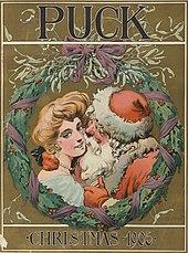 Images of Santa Claus were further popularized through Haddon Sundblom's depiction of him for The Coca-Cola Company's Christmas advertising in the 1930s.[8][40] The popularity of the image spawned urban legends that Santa Claus was invented by The Coca-Cola Company or that Santa wears red and white because they are the colors used to promote the Coca-Cola brand.[41] Coca-Cola's competitor Pepsi-Cola used similar Santa Claus paintings in its advertisements in the 1940s and 1950s. Historically, Coca-Cola was not the first soft drink company to utilize the modern image of Santa Claus in its advertising—White Rock Beverages had already used a red and white Santa to sell mineral water in 1915 and then in advertisements for its ginger ale in 1923.[42][43][44] Earlier still, Santa Claus had appeared dressed in red and white and essentially in his current form on several covers of Puck magazine in the first few years of the 20th century.[45]