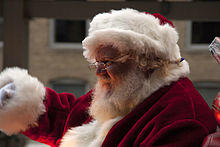 Actors portraying Santa Claus appear in the weeks before Christmas in department stores or shopping malls, or at parties. The practice of this has been credited to James Edgar, as he started doing this in 1890 in his Brockton, Massachusetts department store.[66] The actor dressed up as Santa is usually helped by other actors (often mall employees) dressed as elves or other creatures of folklore associated with Santa. His function is either to promote the store's image by distributing small gifts to children, or to provide a seasonal experience to children by listening to their wishlist while having them sit on his knee (a practice now under review by some organisations in Britain,[67] and Switzerland[68]). Sometimes a photograph of the child and actor portraying Santa are taken. Having a Santa actor set up to take pictures with children is a ritual that dates back at least to 1918.[69]