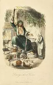 Father Christmas dates back as far as 16th century in England during the reign of Henry VIII, when he was pictured as a large man in green or scarlet robes lined with fur.[14] He typified the spirit of good cheer at Christmas, bringing peace, joy, good food and wine and revelry.[14] As England no longer kept the feast day of Saint Nicholas on 6 December, the Father Christmas celebration was moved to 25 December to coincide with Christmas Day.[14] The Victorian revival of Christmas included Father Christmas as the emblem of good cheer.[15] His physical appearance was variable,[16] with one famous image being John Leech's illustration of the "Ghost of Christmas Present" in Charles Dickens's festive classic A Christmas Carol (1843), as a great genial man in a green coat lined with fur who takes Scrooge through the bustling streets of London on the current Christmas morning, sprinkling the essence of Christmas onto the happy populace.[14][15]