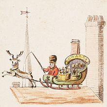 In 1821, the book A New-year's present, to the little ones from five to twelve was published in New York. It contained Old Santeclaus with Much Delight, an anonymous poem describing Santeclaus on a reindeer sleigh, bringing rewards to children.[30] Some modern ideas of Santa Claus seemingly became canon after the anonymous publication of the poem "A Visit From St. Nicholas" (better known today as "The Night Before Christmas") in the Troy, New York, Sentinel on 23 December 1823; Clement Clarke Moore later claimed authorship, though some scholars argue that Henry Livingston, Jr. (who died nine years before Moore's claim) was the author.[8][31] St. Nick is described as being "chubby and plump, a right jolly old elf" with "a little round belly", that "shook when he laughed like a bowlful of jelly", in spite of which the "miniature sleigh" and "tiny reindeer" still indicate that he is physically diminutive. The reindeer were also named: Dasher, Dancer, Prancer, Vixen, Comet, Cupid, Dunder and Blixem (Dunder and Blixem came from the old Dutch words for thunder and lightning, which were later changed to the more German sounding Donner and Blitzen).[32]